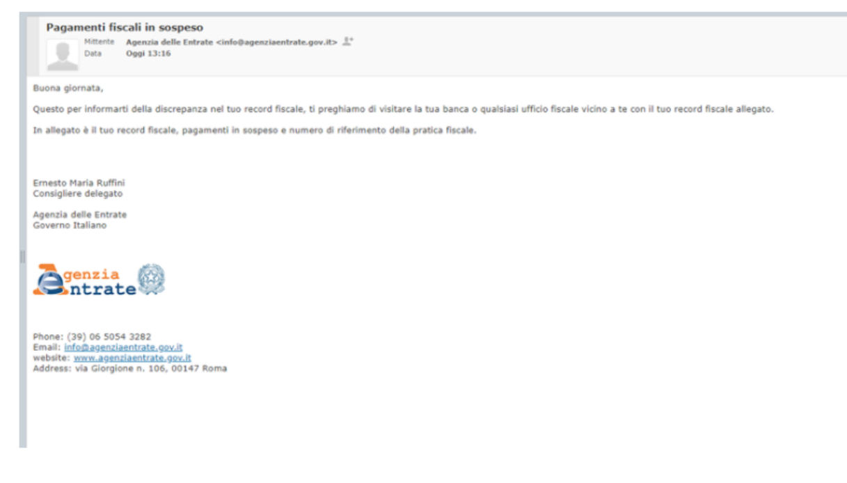 Le mail sono inviate da un indirizzo di posta elettronica riconducibile ma solo in apparenza all’Agenzia e con la firma del direttore. Nel corpo della mail si invitano i destinatari a recarsi presso “la banca o un ufficio fiscale” portando con sé la stampa del file allegato.