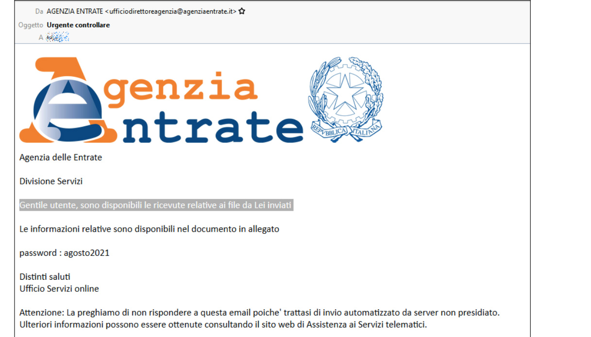 Come prima cosa è “firmato” dall’Ufficio Servizi Online, che peraltro, come verificabile nell’organigramma presente sul sito istituzionale, è denominato “Ufficio Servizi on line”, ma è inviato apparentemente da una casella dell’Ufficio del Direttore dell’Agenzia, che non viene in ogni caso utilizzata per comunicazioni di questo tipo). Inoltre, l’oggetto è quanto mai generico e dentro alla mail compare addirittura una password, il che rende evidentemente inutile il fatto che l’archivio sia protetto e serve solo a impedire agli antivirus di analizzarne il contenuto.