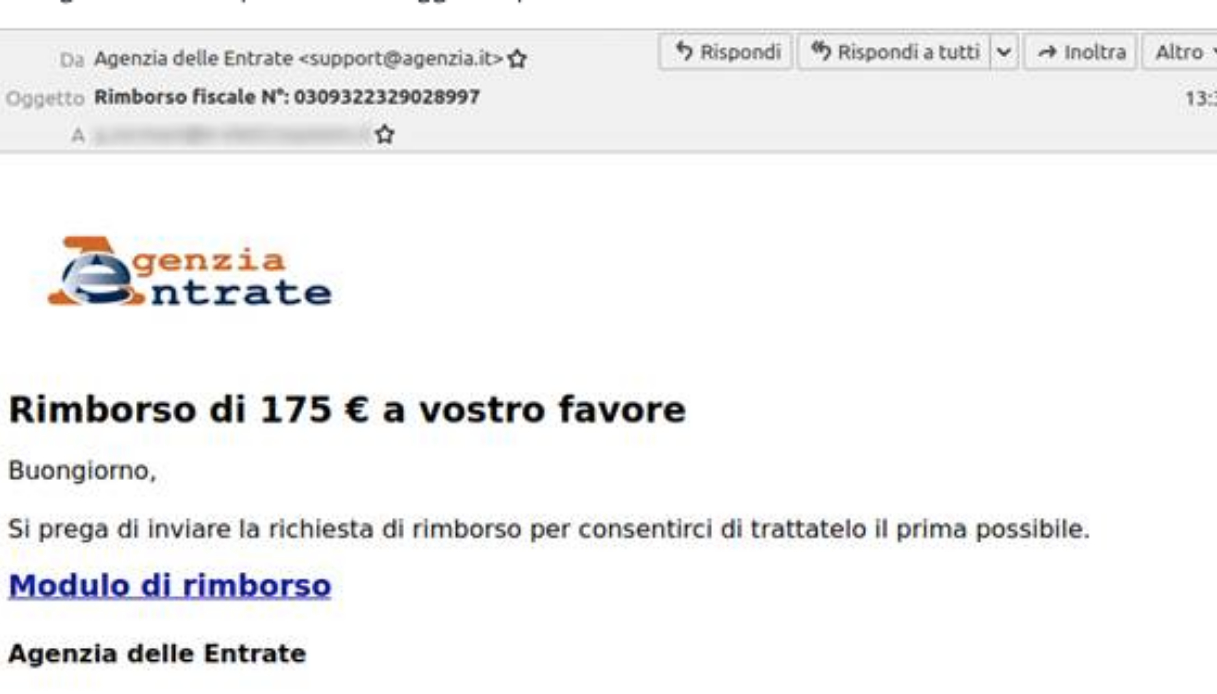Alcune settimane fa era stato riscontrato un altro tentativo di raggiro che sfruttava anch’esso il nome dell’Agenzia delle Entrate. Le mail, in quel caso, contenevano il logo dell’Agenzia e presentavano un oggetto variabile (ad esempio “Rimborso fiscale N°”, “Avviso di rimborso” o “Il vostro rimborso”) e chiedevano di inviare una richiesta per poter trattare il rimborso.